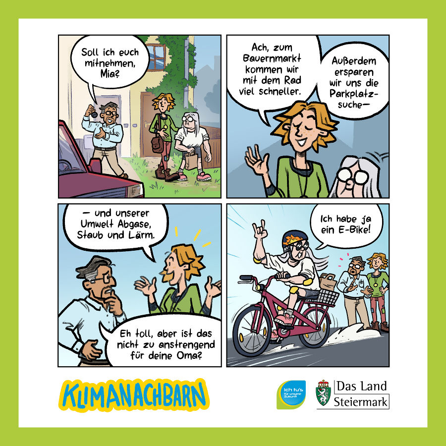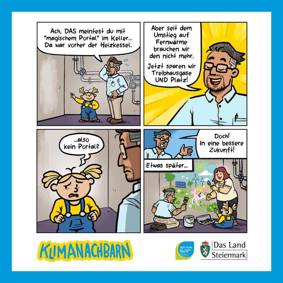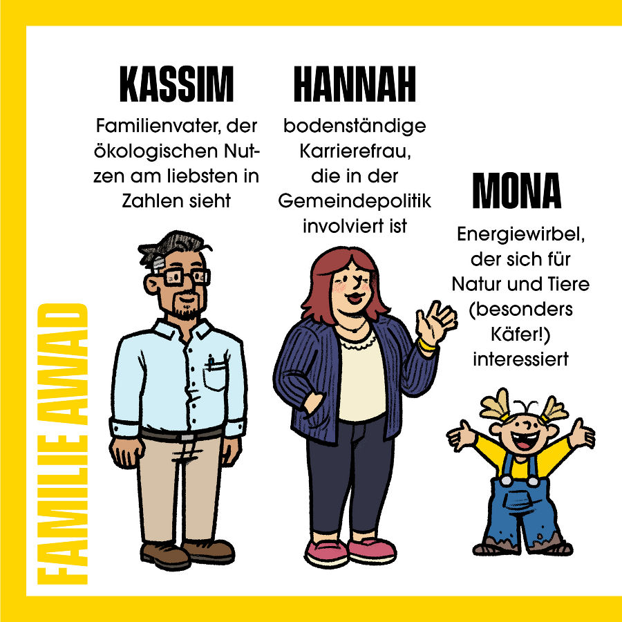 Kennen Sie schon unseren Klimaschutz-Comic, die „Klimanachbarn"? Unter einem geteilten Dach leben diese beiden charmant-chaotischen Familien in jeweils einer Doppelhaushälfte und unterstützen sich dabei, durch bewusstes Handeln eine bessere Zukunft herbeizuführen. Begleiten Sie Reiters und die Awads durch ihre täglichen Abenteuer und lernen Sie gemeinsam mit ihnen, wie einfach es sein kann, wichtige Klimaschutzmaßnahmen in den eigenen Alltag einzubauen.